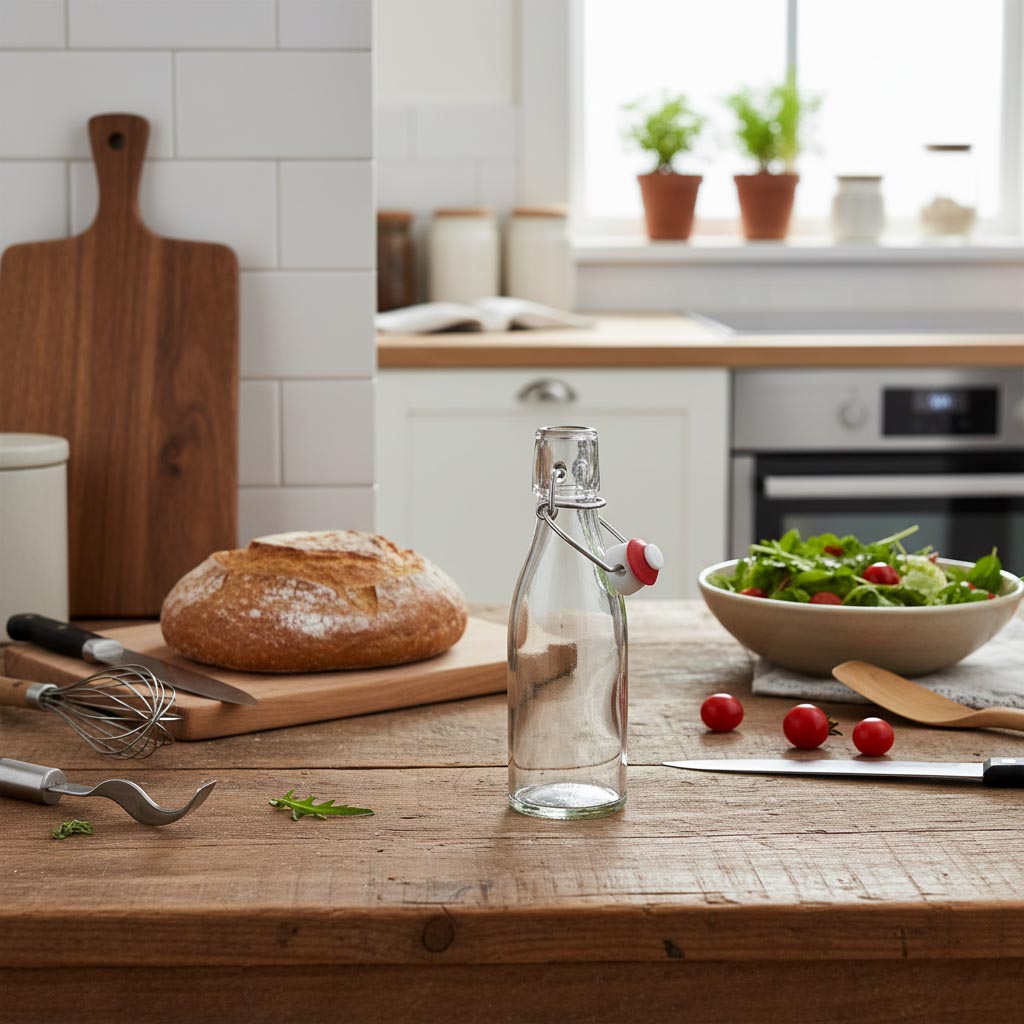 'Paul' is een 200 ml fles van transparant glas met een elegante retrovorm, geschikt voor het vullen van oliën, gedistilleerde dranken en andere producten. De fles is compatibel met een beugelsluiting, bestand tegen koude en hitte, en geschikt voor de vaatwasser, magnetron en oven.
