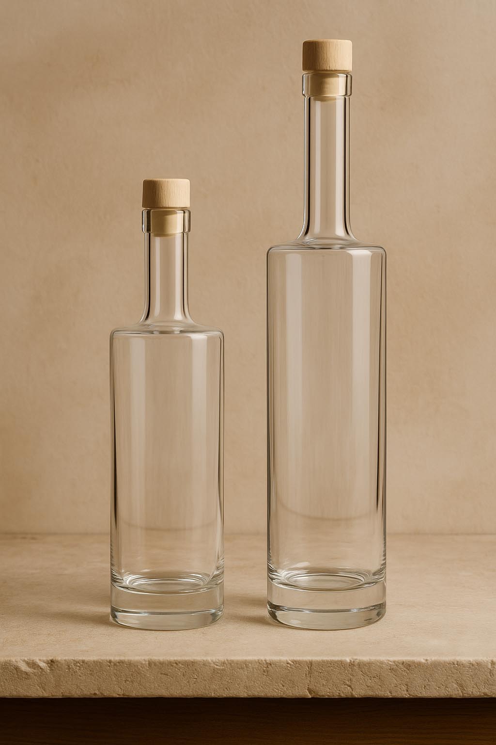 De serie "Titano" combineert een krachtige uitstraling met verfijnde eenvoud en zet nieuwe normen in de wereld van hoogwaardige glazen verpakkingen. Deze elegante cilindervormige fles van helder glas valt op door een massieve glazen bodem, die niet alleen stabiliteit biedt, maar ook visuele diepte en exclusiviteit uitstraalt. Verkrijgbaar in de maten 500 en 700 ml, is "Titano" perfect geschikt voor hoogwaardige gedistilleerde dranken, verfijnde likeuren en karaktervolle distillaten. De kurkafsluiting zorgt voor een klassieke en veilige verzegeling – bijpassende sluitingen zijn verkrijgbaar in ons assortiment. Met zijn robuuste elegantie en tijdloze esthetiek is "Titano" de ideale keuze voor veeleisende merken die waarde hechten aan kwaliteit en expressiviteit.