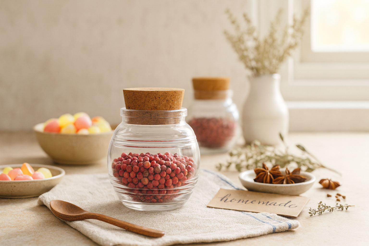 De serie "Jule" combineert esthetische elegantie met praktische functionaliteit en biedt een stijlvolle oplossing voor het opbergen van kruiden, snoepjes en andere fijne lekkernijen. Het bolvormige kurkenglas valt op door zijn zacht afgeronde vorm en het karakteristieke streepreliëf, dat het een bijzondere tastzin en een nostalgische charme geeft. De ronde basis zorgt voor een harmonieuze uitstraling, terwijl de kurken hals een veilige en natuurlijke afsluiting mogelijk maakt. Jule is niet alleen een praktisch opbergglas, maar ook een decoratief hoogtepunt dat in elke keuken of op elke tafel accenten zet.